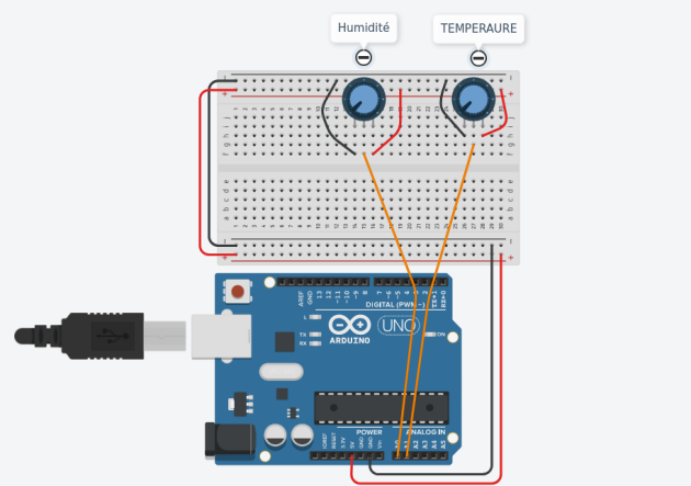 Pour gagner du temps dans la mise en oeuvre, on simulera les capteurs à l'aide de potentiomètres :