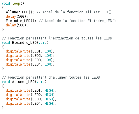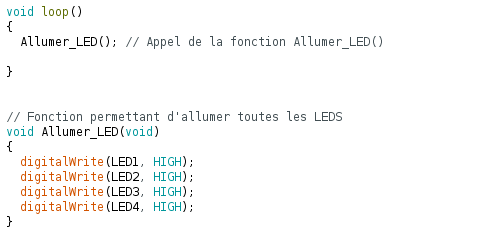 Dans cette première partie nous allons reprendre le programme de test qui permettait de faire clignoter les 4 LEDs et l'alléger un peu. Pour se faire nous allons définir une fonction Allumer_LED() que nous pourrons appeler à tout moment dans notre programme. La définition de cette fonction (son écriture) pourra se situer après la fonction loop() :