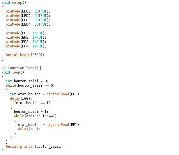 A partir du programme précédent nous allons réécrire la fonction loop(). Dans cette fonction le programme interrogera chaque entrée pour déterminer s'il y a eu un appui ou non. Nous allons donc répéter une opération de lecture pour chaque bouton poussoir. Cette procédure sera assez semblable à la première activité (comptage du nombre d'appuis sur le BP). Pour le premier bouton poussoir elle peut s'écrire ainsi :