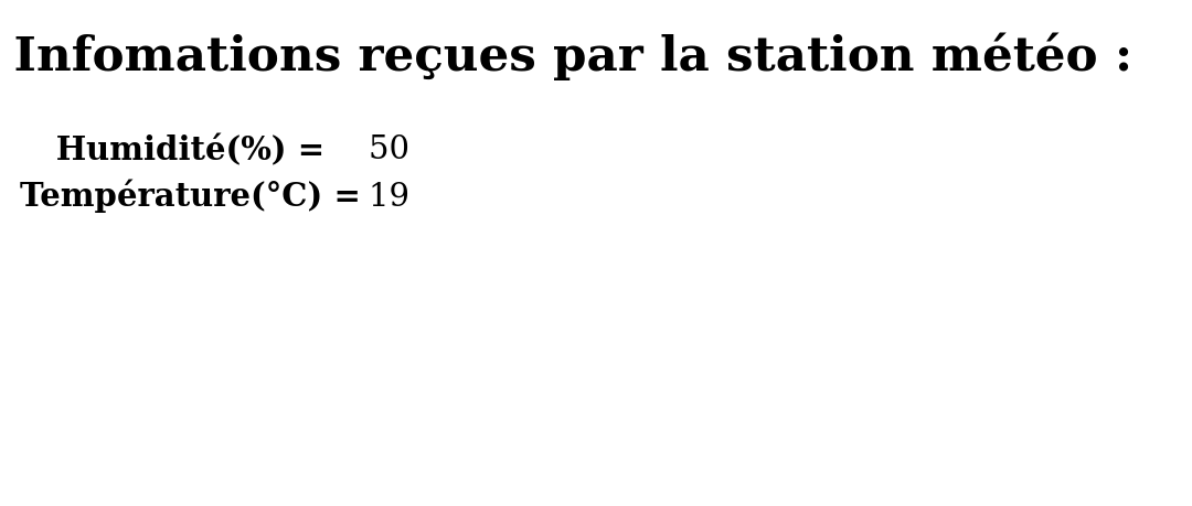 <!DOCTYPE html><html lang="en"><head> <meta charset="UTF-8"> <meta name="viewport" content="width=device-width, initial-scale=1.0"> <title>Station metéo </title></head><body> <h2>Infomations reçues par la station météo :</h2> <table> <tbody> <tr> <th scope="row">Humidité(%) = </th> <td>50</td> </tr> <tr> <th scope="row">Température(°C) =</th> <td>19</td> </tr> </tbody> </table> </body></html>"""run(host='0.0.0.0', port=8585, debug=True)