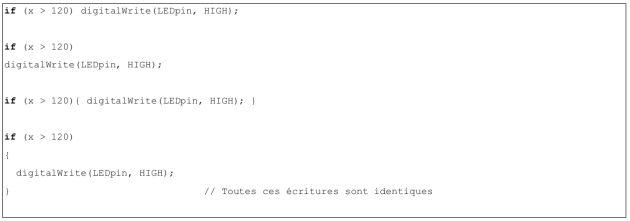 Dans l'exemple ci-dessus, le traitement est effectué si la variable est supérieure à 50. Les accolades peuvent être omises. Si c'est le cas seule l'instruction qui suivra sera exécutée de manière conditionnelle. L'exemple suivant montre des écritures identiques :