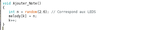 On rappelle ici que le jeu répète la même couleur et le même son, puis ajoute au hasard une nouvelle couleur. Il faut donc que le jeu "garde en mémoire" la séquence qu'il joue pour la rejouer au prochain tour et ajouter une note. Cette séquence peut être stockée dans un tableau (Array en anglais) contenant des variables (de type int).