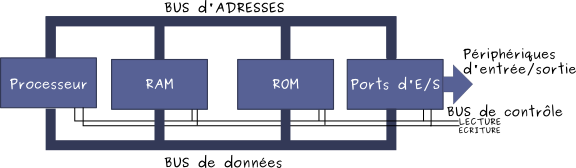 Pour communiquer au sein de ce système, le processeur «écrit » sur le bus d'adresse l'adresse du composant ou d'une case mémoire avec lesquels il peut communiquer. L'information entre deux composants circule via le bus de données.