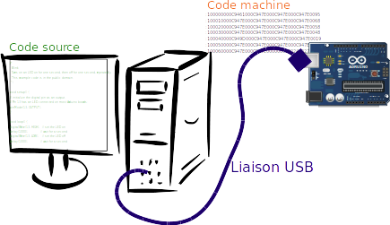 Compiler : Transformation du code source (langage de programmation) en code machine (suite de 0 et de 1 interprétable par la machine : fichier xxx.hex)