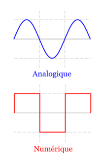 L'électronique numérique qui utilise des variations « abruptes » de la tension qui va prendre 2 niveaux (interrupteur = allumé ou éteint) :