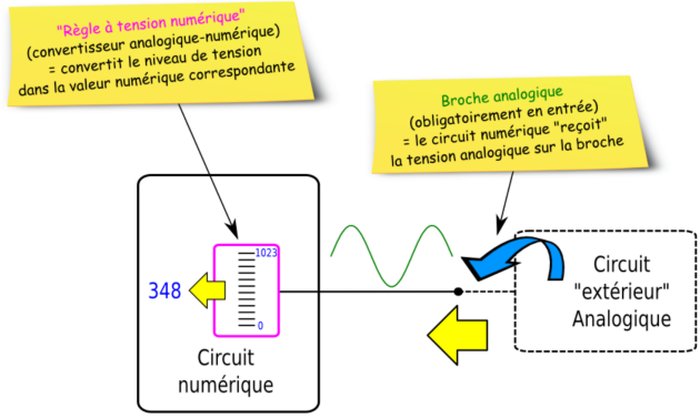 Dans Arduino il suffit simplement d'appliquer une tension entre 0 et 5V sur une des broches dite « analogique » pour obtenir une valeur entre 0 et 1023correspondant au niveau de la tension présente sur la broche !