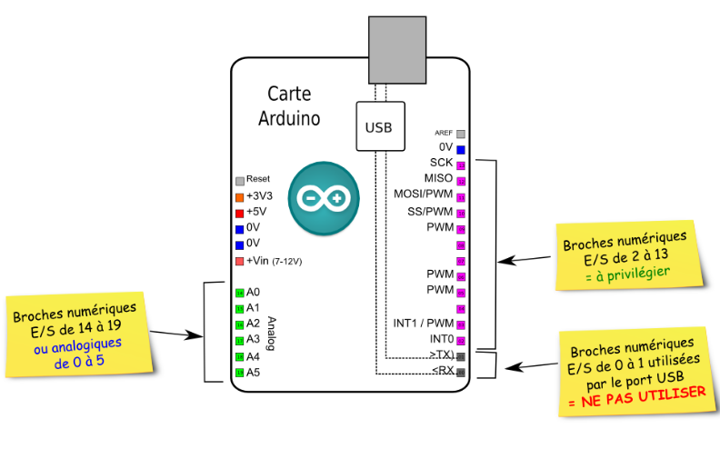 La carte Arduino UNO est une carte numérique qui possède 20 broches d'Entrée/Sortie numérique (notées E/S) numérotées de 0 à 19. Les broches 0 à 19 sont potentiellement utilisables en broches E/S cependant, certaines broches ne doivent pas, dans la mesure du possible être utilisées en broches E/S :