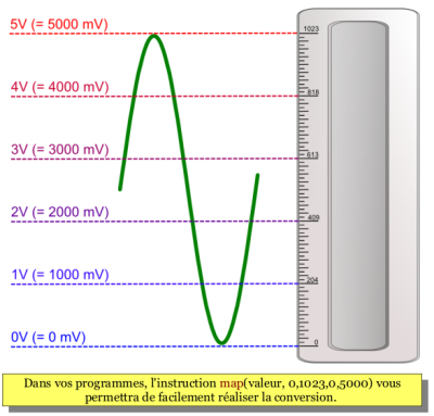 • la graduation nnn correspond à nnn x 5000 / 1023 mV