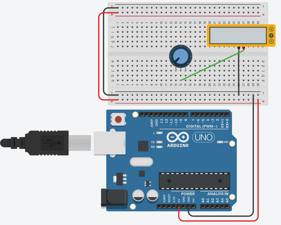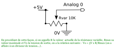 Principe général d'utilisation Le principe général d'utilisation d'une résistance variable avec une carte Arduino va consister : à connecter la résistance principale entre le 0V et le 5V à connecter la broche variable sur une entrée analogique.