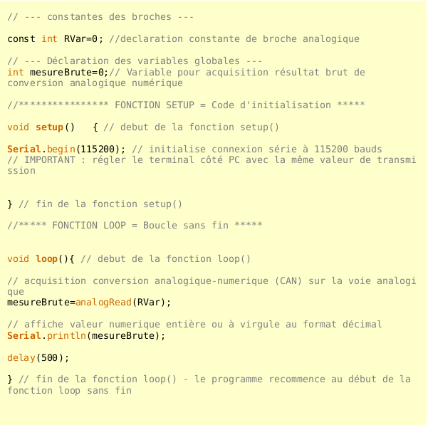 on réalise une mesure à l'aide de la fonction analogRead(brocheAnalogique) : le résultat est stocké dans une variable. Ensuite, on affiche le résultat dans le Terminal Série à l'aide de la
