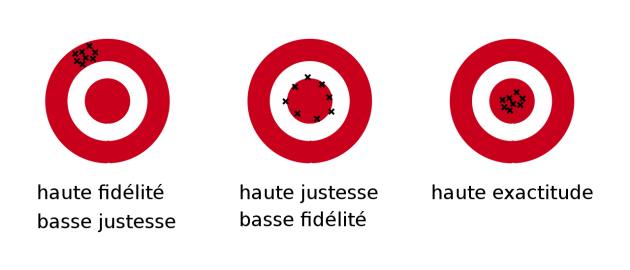 On peut représenter symboliquement la fidélité, la justesse et l'exactitude de la manière suivante :