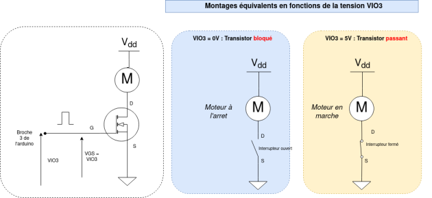 Sans rentrer dans les détails, on considère ici le fonctionnement simplifié (idéalisé) : Interrupteur commandé par la tension VGS. Pour commander le moteur on le placera ainsi :