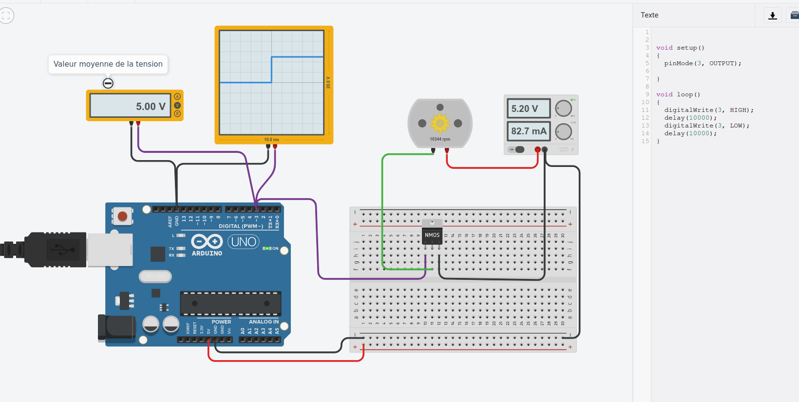 Pour commander le moteur avec une carte Arduino il est indispensable d'insérer un transistor entre les deux. En effet un microcontrôleur peut fournir jusqu'à 20 mA par broche d'E/S, assez pour alimenter une LED mais insuffisant pour le moteur qui sans charge ici consomme déjà 80mA. On insère donc un transistor MOSFET.