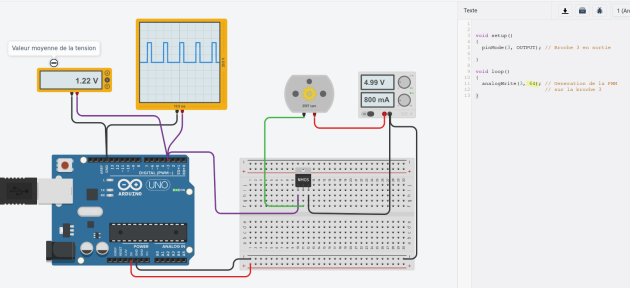 Nous avons vu que la valeur de la tension aux bornes du moteur agit sur sa vitesse. La carte arduino UNO comme beaucoup de carte microcontrôleur ne possède que des sorties numériques : soit 0 V ou 5V, pas de valeurs intermédiaires. La carte arduino est capable cependant de générer des signaux carrés dont la largeur d'impulsion est modulée (MLI ou PWM : Pulse Width Modulation).
