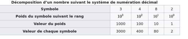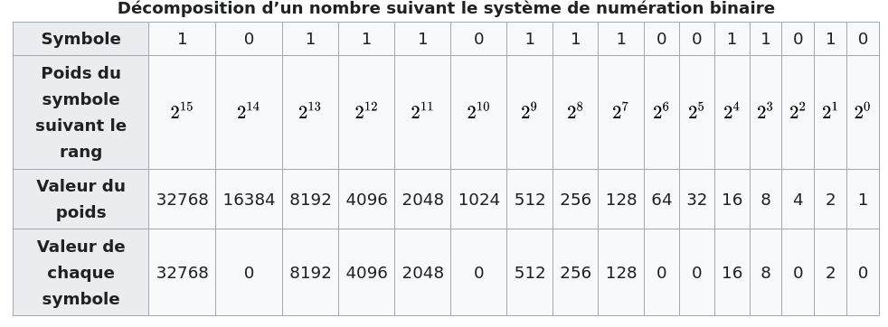 Les bases utilisées pour compter sont toutes des systèmes de numération pondérés, cela siginfie que le système comprend :