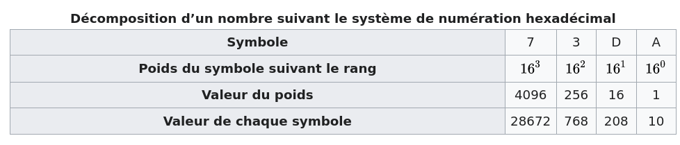 Tout comme en octal, on retrouve des valeurs identique entre les poids des rangs en système hexadécimal et les poids des rangs binaires.