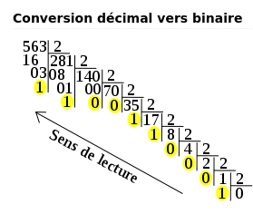 Sur l'image ci-dessus, c’est la conversion du nombre 563 en son équivalent en binaire : le reste d'une division par deux ne peut être que 0 ou 1. On obtient donc :