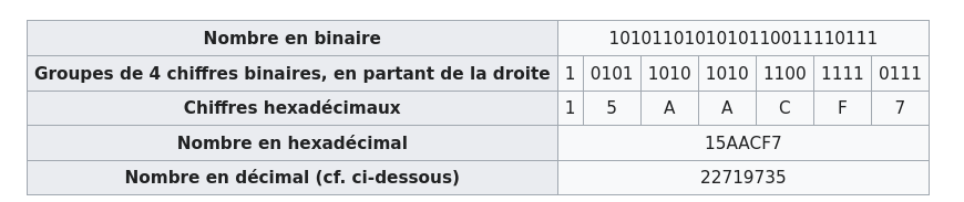 La conversion de binaire en hexadécimal se fait en regroupant les chiffres (les bits) quatre par quatre, ou inversement en remplaçant chaque chiffre hexadécimal par 4 chiffres binaires, du fait que 16 = 24. La justification de la conversion d'hexadécimal en binaire est donnée pour des nombres de 0 à 255 qui s'écrivent avec au plus deux chiffres hexadécimaux ou 8 chiffres binaires, :