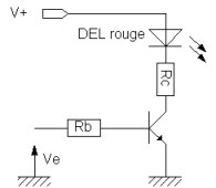 2°) lorsque Ve=5V, donner l'état du transistor (bloqué ou conducteur). En déduire l'état de la diode électroluminescente. Représenter le schéma équivalent du transistor et de la LED.