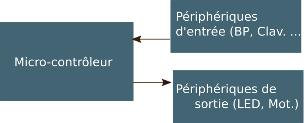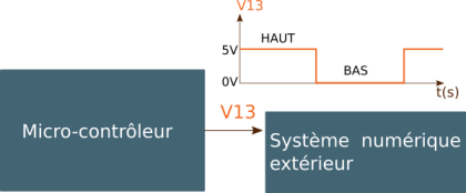 Un microcontrôleur possède un certains nombre de broches numériques (2 états possibles 0 ou 5V) permettant soit d'interroger l'état d'un périphérique d'entrée (bouton poussoirs, claviers, ...) soit de piloter des périphériques de sortie (LED, écran LCD, ... ).