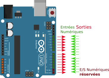 La carte Arduino UNO possède 20 broches numériques configurables en entrée ou en sortie. Il est conseillé cependant d'utiliser les broche 2 à 13 (les broches 0 et 1 sont utilisées pour la programmation et les broches 14 à 19 sont dédié aux entrées analogique). Les broches d'un Arduino peuvent être configurées en entrée ou en sortie (par défaut elles sont configurées en entrée).