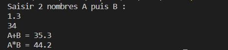 L'utilisateur est invité à saisir 2 nombres à virgule le programme affiche la somme au terminal puis le programme affiche le produit