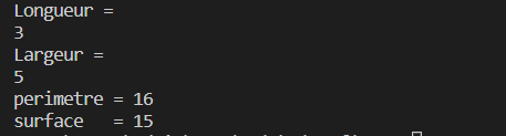 L'utilisateur est invité à saisir 2 nombres : La longueur et la largeur d'un rectangle. Le programme affiche la surface et le périmètre.