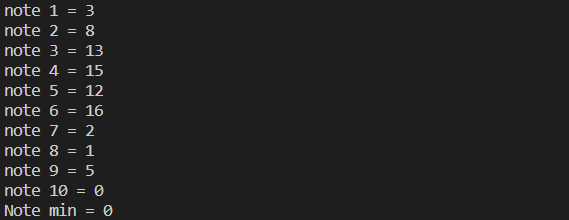 L'utilisateur est invité à saisir 10 notes entre 0 et 20. Le programme calcule et affiche le minimum de ses 10 notes.