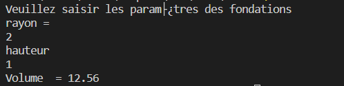 Le programme affiche : Veuillez saisir les parametres des fondations. L'utilisateur saisit le rayon et la hauteur et le programme calcule et affiche le volume du cylindre.