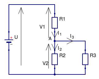 Sur le schéma électrique ci-contre, la tension d'alimentation vaut : U=15V. La tension V2 = 10V.