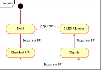Le comportement du feu peut-être décrit par le diagramme de machine d'état suivant :