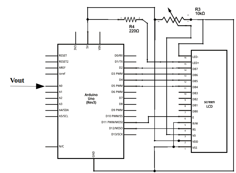 Les broches aux extrémités d'un potentiomètre de 10K sont reliées au +5V et au GND. La broche du milieu est, elle, reliée au Vo (pin3).