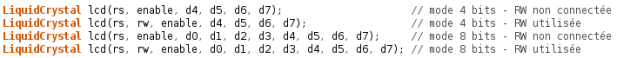 Constructeurs : Avant le setup(), un objet de la classe LiquidCrystal doit être instancié. 4 constructions sont possibles :