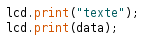 Permet l'écriture soit d'une chaîne de caractères (''texte'') soit des valeurs de variables (char, byte, int, long, float ou string)