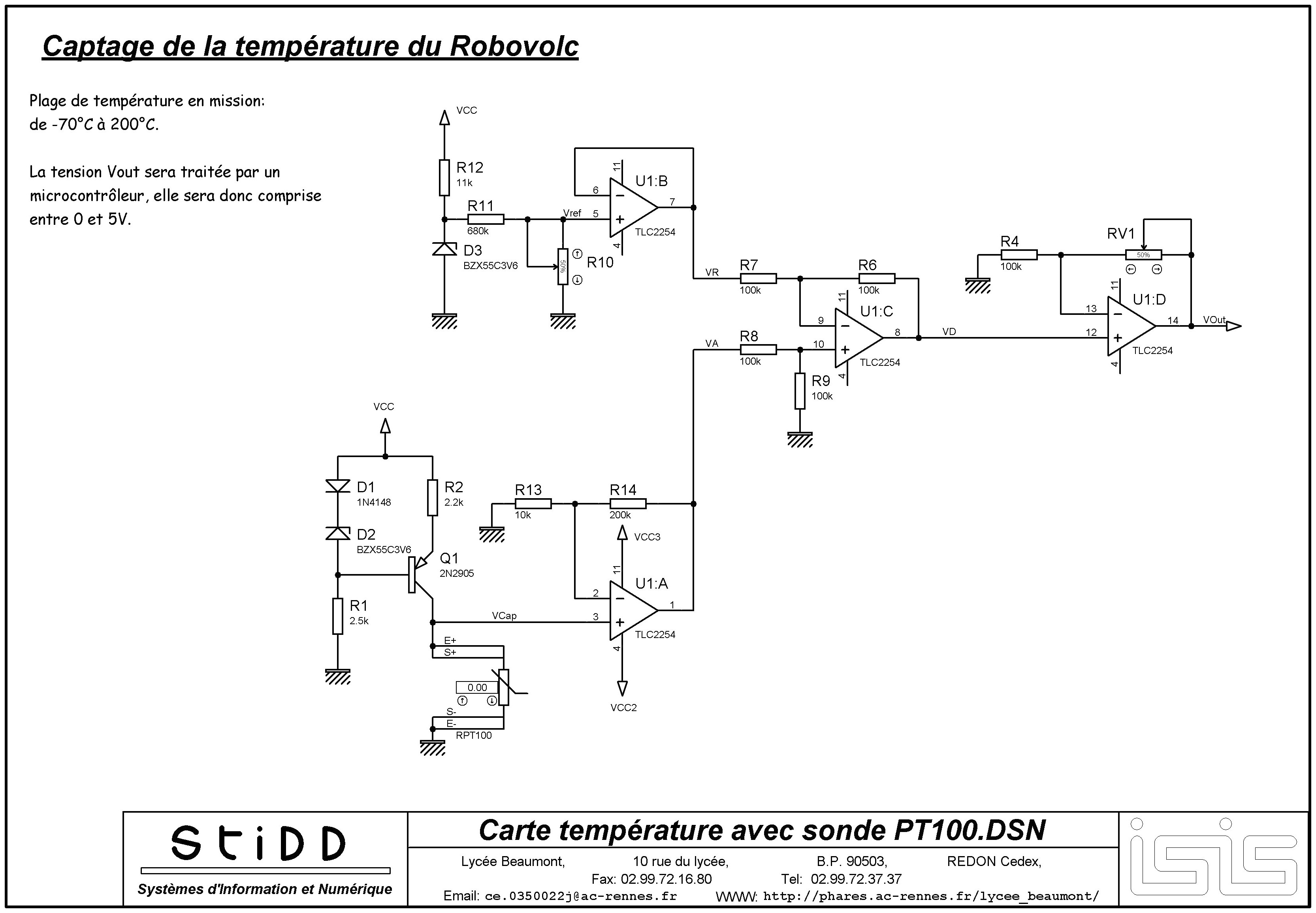 Le Robovolc est équipé d'un capteur de température industriel (PT100) qui est approprié pour travailler dans des conditions extrêmes (-200°C à +900°C). Pour les missions en cours , les scientifiques estiment que les valeurs de températures extrêmes sont comprises entre -70°C et +200°C. En sachant que ces valeurs doivent être traitées ensuite par le convertisseur analogique numérique d'un microcontrôleur dont la gamme de tension sera comprise entre 0 et 5V, il faut, pour avoir une précision maximale, que la sortie Vout soit proche de 0 pour une température de -70°C et proche de 5V pour une température de 200°C.On se propose donc de vérifier que la structure proposé répond au cahier des charges et s'il y a bien adaptation de la chaîne d'acquisition aux caractéristiques des grandeurs à acquérir.Le capteur mis en œuvre est une sonde à résistance de platine PT100.