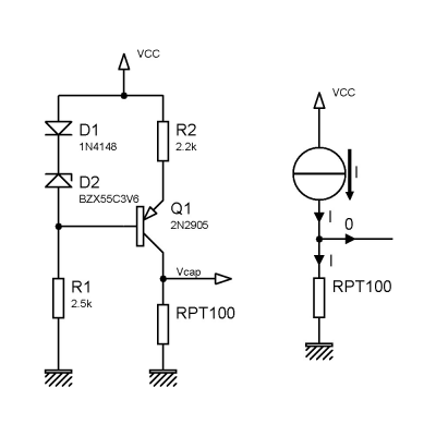 On donne : UD1 = 0,61V ; UD2 = 3,53V ; VebQ1 = 0,67V Cette structure (montage de gauche) est équivalente à un générateur de courant constant (montage de droite).