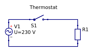 On modélise le circuit électrique par une simple résistance en série avec l'interrupteur du thermostat qui est ouvert lorsque la température dépasse 55°C.