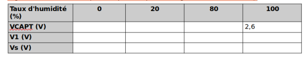 Calculer les valeurs de V1(V) pour les différents taux d'humidité du tableau et reporter ces valeurs dans le tableau page 1.