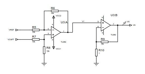 Sachant que R8 = R7 = R6 = R5 = 10kohm, exprimer V1 en fonction de VREF et VCAPT