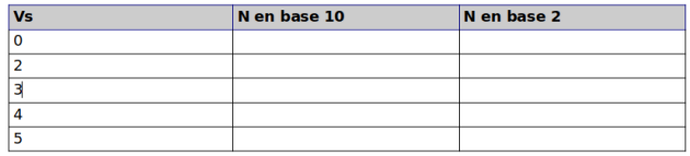 Pour les valeurs valeurs de la tension de sortie de la carte Vs du tableau ci dessous calculer N en décimal puis en binaire