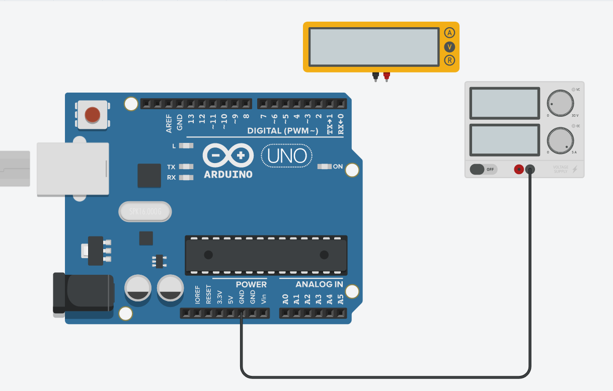 On souhaite étudier le Convertisseur analogique numérique via l'entrée A0. Le générateur fournira une tension variable de 0 à 5V. le multimètre mesurera cette tension.