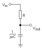 \(A(f) = \frac{V_{out}}{V_{in}} = \frac{1}{1+j 2 \pi RC f}\)