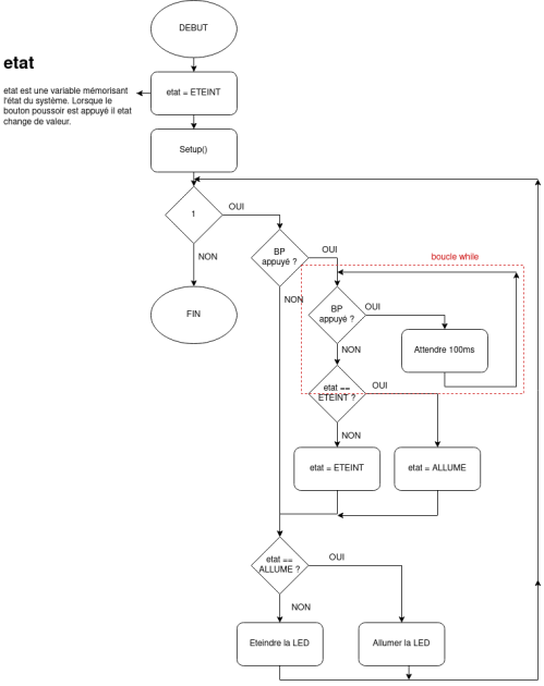On souhaite désormais ajouter un troisième état après avoir appuyé sur le BP pour allumer la LED, la LED devra clignoter, un dernier appui arrêtera la LED et ainsi de suite.