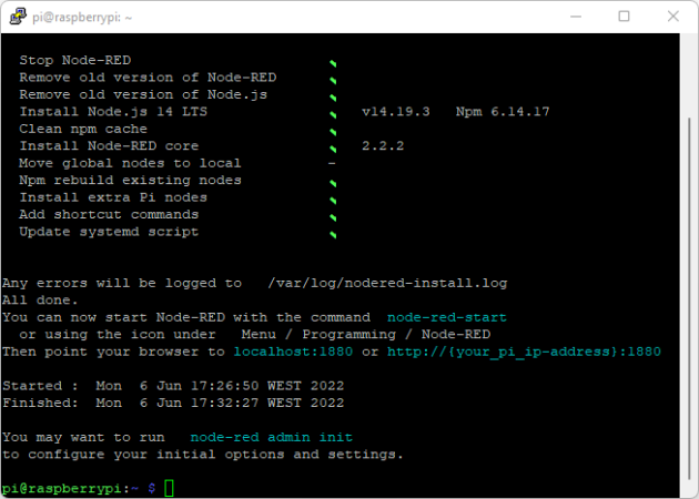 L'installation de Node-RED prendra quelques minutes. Au final, vous devriez obtenir un message similaire sur la fenêtre du Terminal :