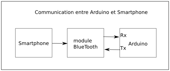 Dans le projet Aerocat le module Bluetooth est commandé via une liaison série. L'application Android du smartphone envoie des informations reçues par la carte grâce une liaison série, constituée de deux câbles Rx pour la réception et Tx pour la transmission.