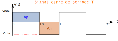 Pour calculer la valeur moyenne d'un signal carré, on doit calculer l'aire Ap du « rectangle » représentant la partie positive du signal et l'aire An représentant la partie négative du signal comme indiquer sur la figure ci-dessous :