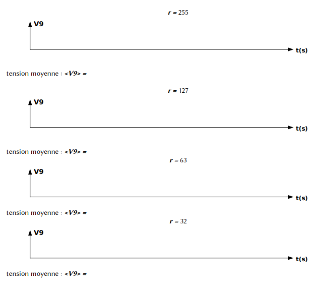 Pour 4 valeurs de r reproduire ci-dessous le signal capté par l'oscilloscope et calculer sa valeur moyenne <V9> :
