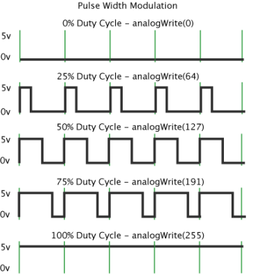 Nous avons vu que la valeur de la tension aux bornes du moteur agit sur sa vitesse. La carte arduino UNO comme beaucoup de carte microcontrôleur ne possède que des sorties numériques : soit 0 V ou 5V, pas de valeurs intermédiaires. La carte arduino est capable cependant de générer des signaux carrés dont la largeur d'impulsion est modulée (MLI ou PWM : Pulse Width Modulation).